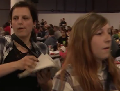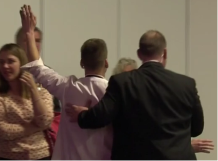 erhoben, Flugblattverteilung auf Bundesparteitag der Linken in Magdeburg, 28.05.16, Text: “Torten für Menschenfeinde”. Mann mit Kurzrasur-