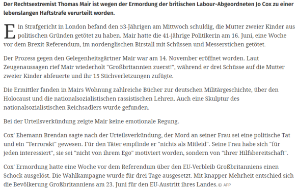 einer Frage von Leben und Tod macht, darf nicht überrascht sein, wenn ihn jemand beim Wort nimmt." Spekuliert wird nun, ob nach dem Tod von Cox die Geschlossenheit der Brexit-Befürworter auf dem Spiel steht. Londons