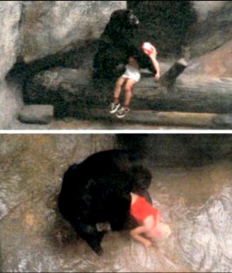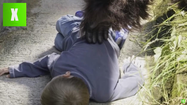 Ein Gorilla streichelt ein ohnmächtiges Kind, dass in einem Zoo